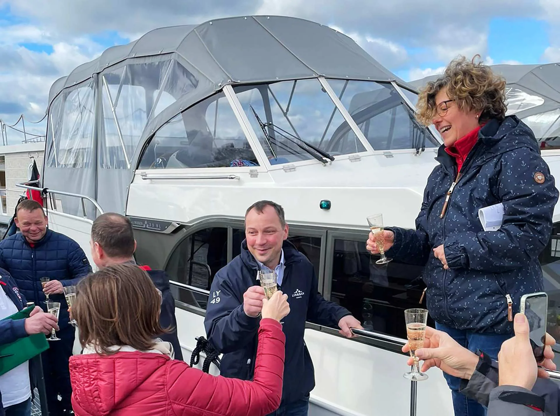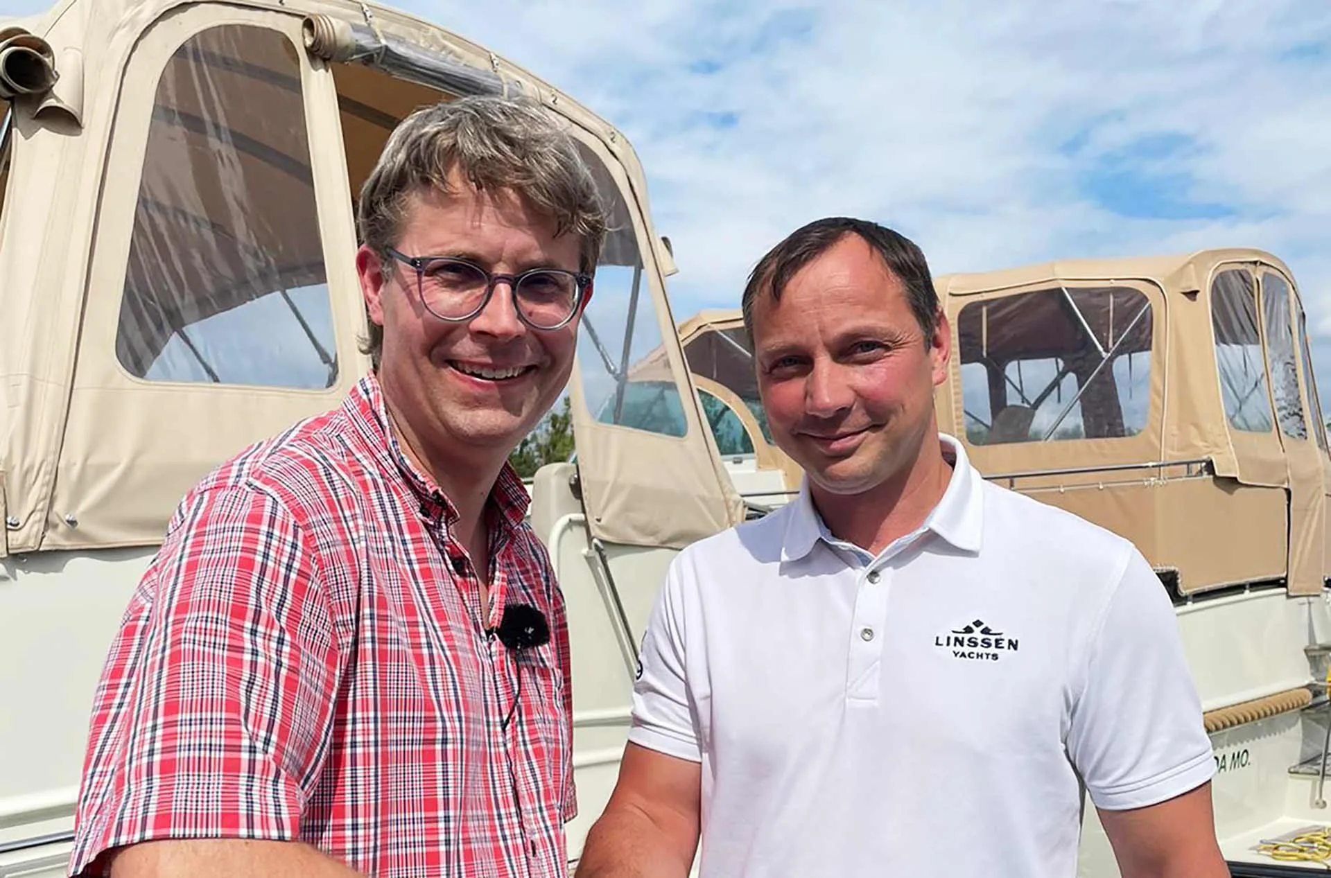 „Ich habe Dirk angeboten, mich nebenbei, also irgendwie vormittags, um den Verkauf zu kümmern. Denn die Lackiererei wollte ich nicht aufgeben. Außerdem wusste ich ja noch nicht, ob und wie gut es laufen würde.“ Dirk willigt ein. Da gibt es EastWest schon: Beide fahren zu Uwe nach Köln, denn der muss auch seinen Segen dazugeben. „Ich habe nochmals eine Nacht drüber geschlafen – und dann ging es am nächsten Tag gleich los!“ Dirk und Mathias fahren weiter zu LINSSEN in die Werft – dort ist das traditionelle „Season Opening“. Er wird diesmal nicht als Lackierer vorgestellt, sondern als neuer Yacht-Berater für das EastWest Yacht-Zentrum, als Boots-Verkäufer. Die Linssen-Familie überreicht ihm feierlich das Hemd mit dem Logo – und man schaut etwas skeptisch …