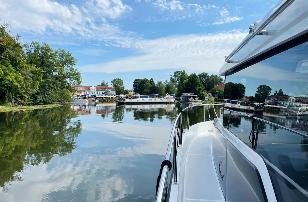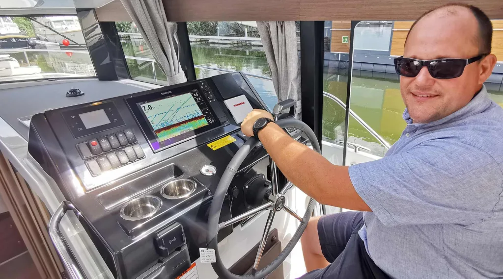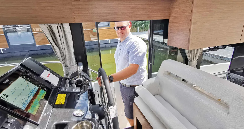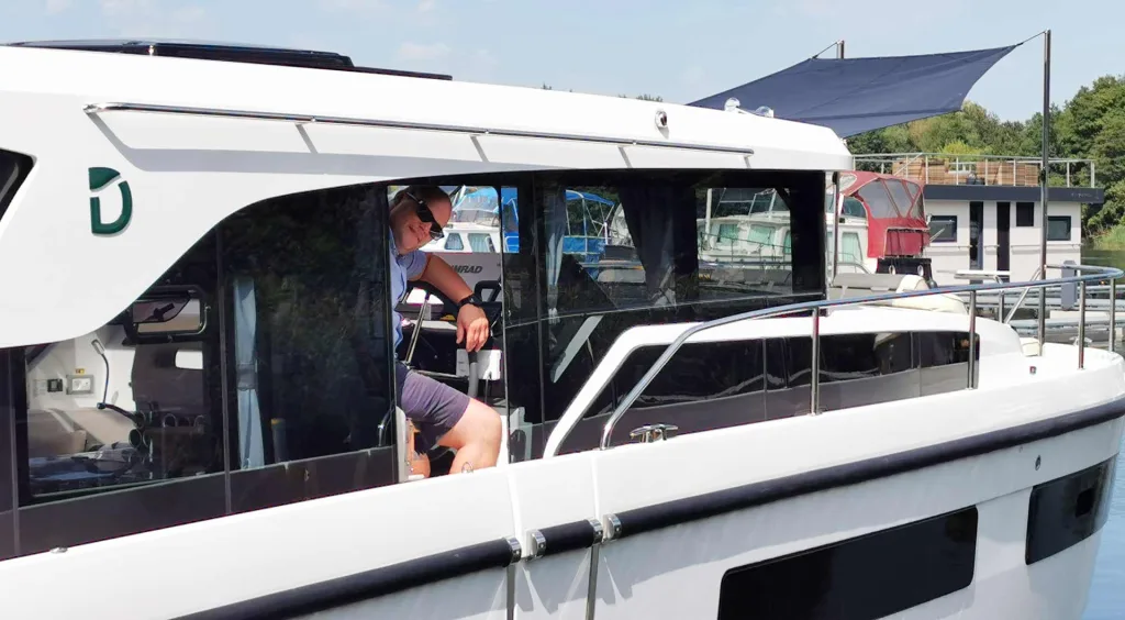 Sebastian winkt uns an Bord – und das aus der praktischen Seitentür am Steuerstand. Diese sorgt nicht nur für stets frische Luft, sondern für eine direkte Kommunikation zwischen Steuermann und Außencrew. Unerlässlich beim An- und Ablegen um mit denjenigen zu sprechen, die die Festmacher-Leinen managen. Und wenn man mal allein unterwegs ist, kann der Skipper selbst problemlos und schnell die Mittschiffsklampe (beim Schleusen etwa) oder den bugwärtigen Festmacher handhaben.
