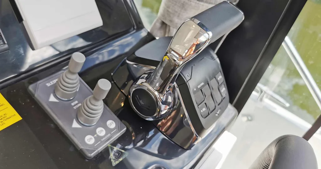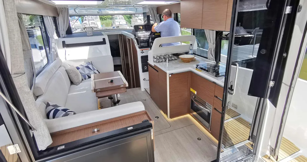 Direkt gegenüber der Seitentür können Sie eine weitere Tür erkennen: Mit dieser lässt sich die Steuerbord-Seite der Yacht öffnen und erlaubt so ein ebenbordiges Ein- und Aussteigen, wenn Sie einmal längsseits anlegen müssen. Gerade bei besonders tiefen Stegen kommt man so ohne Probleme an Bord. Man merkt schon an diesen ersten Details, dass bei der Konstruktion dieser Yacht erfahrene Bootfahrer am Werke waren, finden Sie nicht auch. Nehmen Sie Platz am Steuerstand, Skipper.