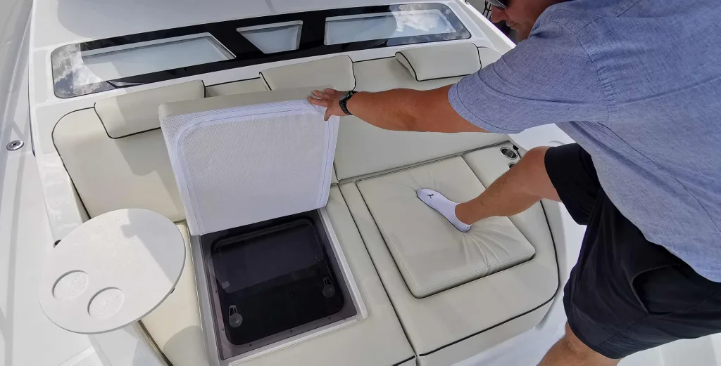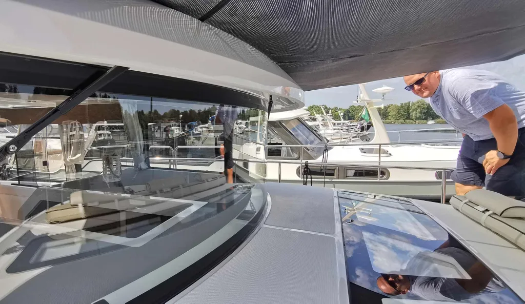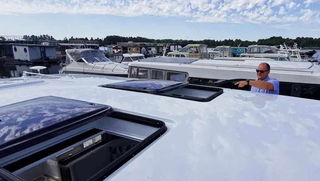 Sebastian deutet in dem unteren Foto auf die wirklich großen Skylights im Dach der Sedan: Diese lassen nicht nur Licht durch, sondern tragen auch zur Durchlüftung der Yacht bei. Wenn geöffnet, streicht sanft frische Luft hinein oder trägt beim Kochen für den schnellen Abzug der Küchendämpfe bei. Apropos Dach, hier wäre sonst die Flybridge, wenn Sie sich für die DELPHIA 11 Flylounge entscheiden (lesen Sie hier mehr dazu).