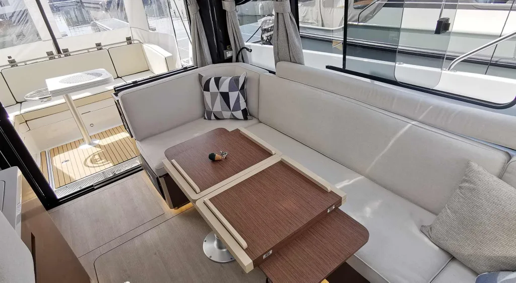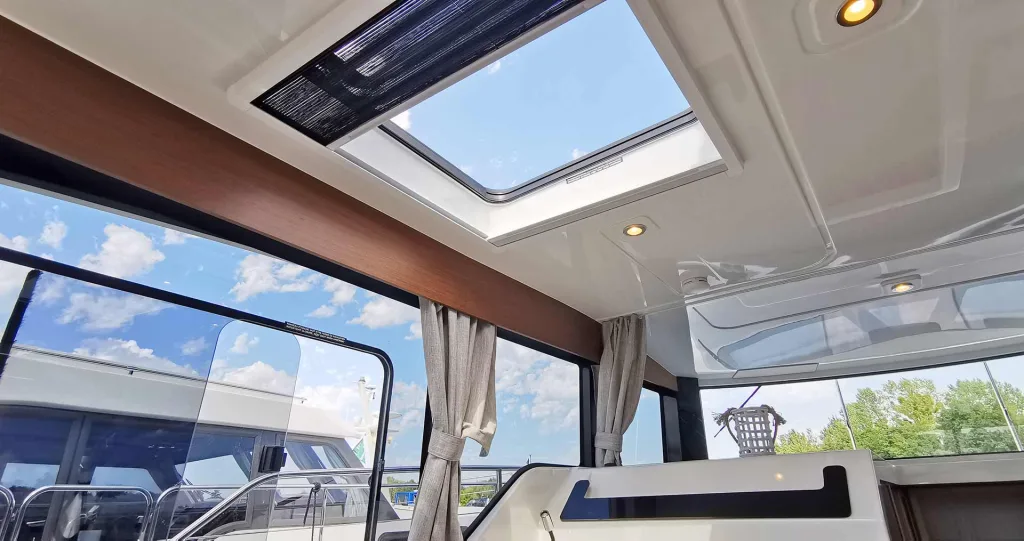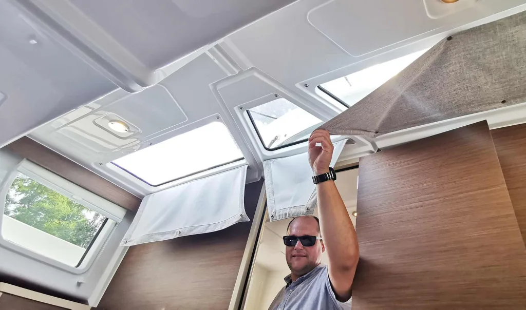 Von den Seiten und von oben kommt zu jeder Tageszeit so ein Optimum an natürlichem Licht in das Boot. Damit müssen Sie so spät wie möglich erst die LED-Verbraucher einschalten, was die Energie-Bordreserven schont. Alle Fensterflächen sind zu verdunkeln: Sollten Sie oder ein Gast den Salon als Schlafplatz nutzen wollen (der Salontisch ist absenkbar und kann zum Bett umgebaut werden), ist damit Privatsphäre und ruhiger Schlaf garantiert.