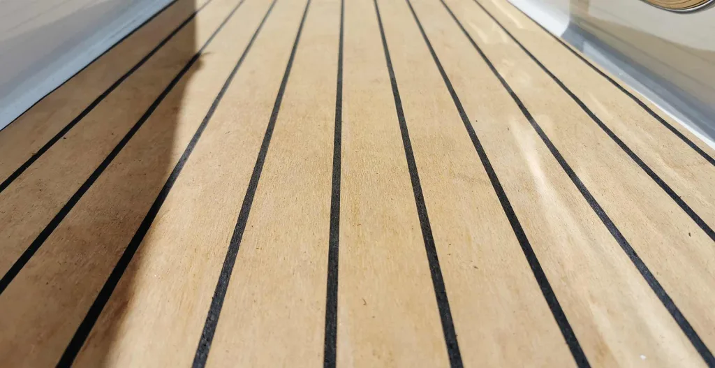 Auch an Deck, übrigens: Schon früh hat die BENETEAU-Gruppe nach einem Ersatz für Teak als Decksbelag gesucht. Gruppen-übergreifen sind bei den Marken des Unternehmens, also bei Jeanneau, Beneteau, Wellcraft, Scarab oder auch Lagoon und Prestige alle Beläge im Einsatz, die Sie kennen: Kork, PVC-Varianten, SeaDek oder auch Echtholz-Decks aus Iroko. Für die DELPHIA-Boote bieten wir ab Werk einen schicken, pflegeleichten PVC-Flexiteak-Belag an. Wenn Ihnen hier etwas anderes vorschwebt, können wir entweder über die Werft selbst oder über unseren eigenen Werft-Service in Zehdenick das Traumdeck mit dem Material Ihrer Wahl installieren. Fragen Sie uns hirzu bitte gern!