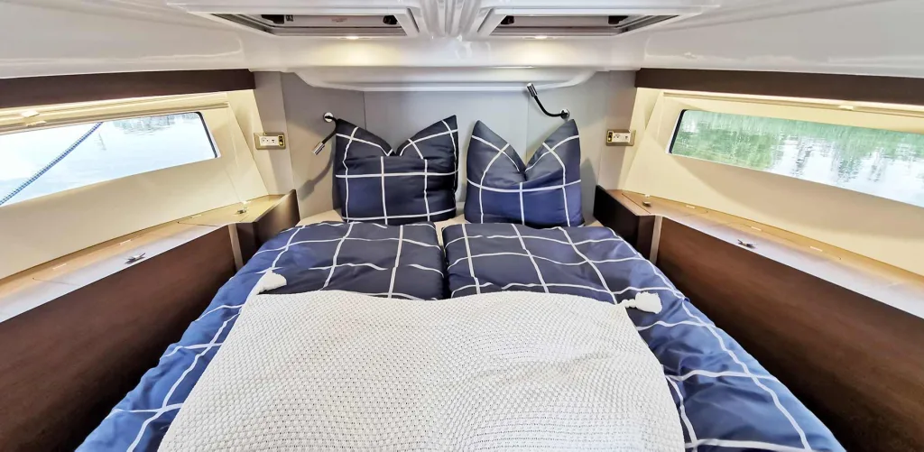Doch keine Sorge, denn „sein“ Schnarchen könnten Sie ausschalten, indem Sie die Vorschiffskabine als Doppelkabine bestellen. Obschon vielleicht eher für den Charter-Betrieb geeignet, wären hier vorn dann zwei vollständige Doppelbetten (mit 4 Schlafplätzen) verfügbar, die durch das große Mitteschott getrennt werden. Dies geht allerdings auf Kosten des Stauraums: Pro Kabine steht dann nur noch jeweils ein Schrank und der Platz unter den Betten zur Verfügung.