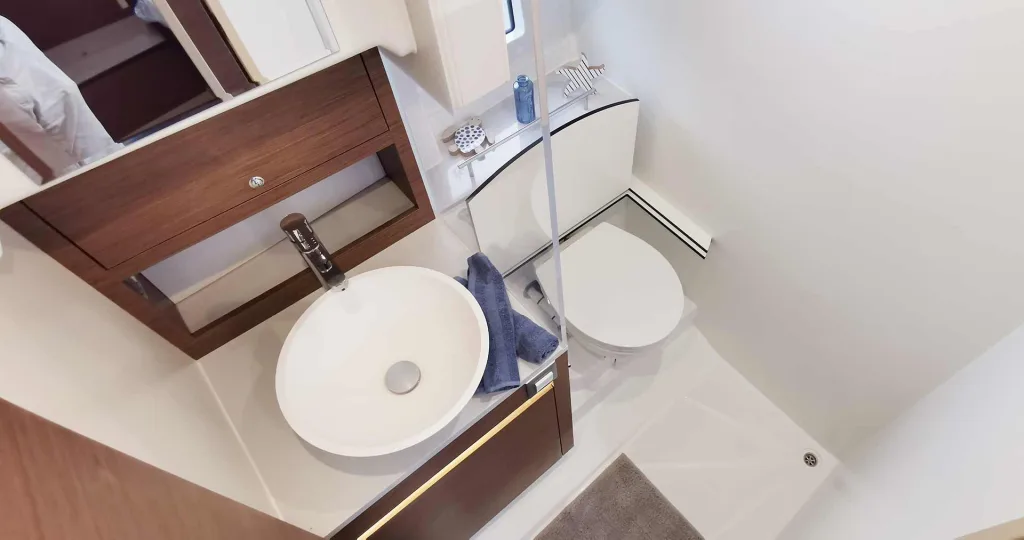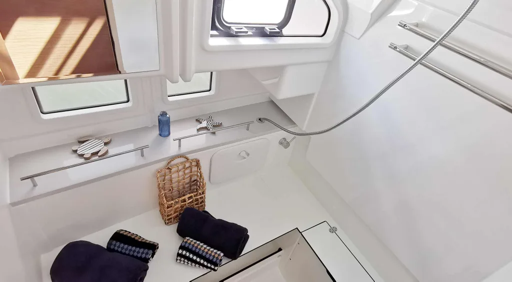 Oder Sie ordern ein WC/Badezimmer wie oben gezeigt und wir bauen das zweite Badezimmer in eine riesengroße Duschkabine um. Das hat den Vorteil, dass man gleichzeitig WC und Dusche nutzen kann, der Duschende viel mehr Platz zum „Ausbreiten“ hat und man nach dem Duschen einfach lüftet – und der nächste WC-Nutzer nicht im nassen, dampferfüllten Duschbad ausrutscht. Für eine Yacht, die eher zu zweit genutzt wird, würden wir letztere Variante empfehlen: In jedem Fall lohnt es sich, vor einem Kauf unbedingt live in WC und Bad zu stehen, um eine informierte Entscheidung zu treffen. Übrigens sind auch WC und Bad natürlich mit Fenstern ausgestattet – für Lüftung und natürliches Licht.