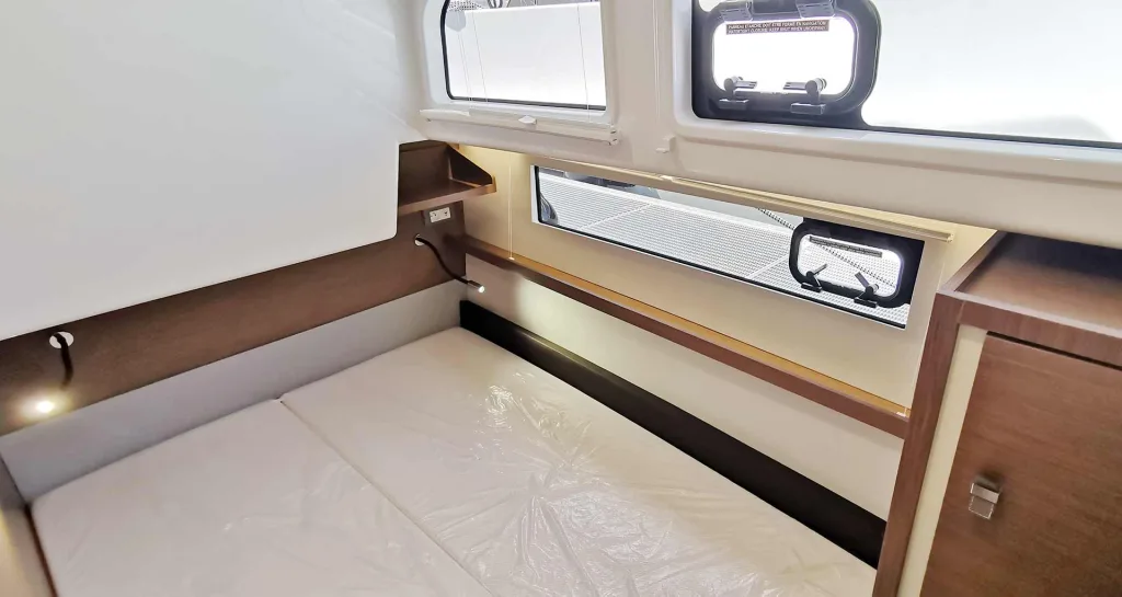 Von außen sieht man der DELPHIA 11 (und den anderen Yachten dieser Marke) an, dass sie sehr moderne Linien haben. Es sind „junge“ Boote für Menschen, die im Hier und Jetzt leben. Ebenfalls immer mehr im Trend, vor allem im Zuge einer sich immer weiter digitalisierenden Arbeitswelt, ist das sogenannte „Boat Office“: Zeitweise oder gar komplettes Arbeiten an Bord. Die Grenze zwischen Lohn-Erwerb und Freizeit verschwimmt. Gerade digitale Jobs oder Arbeit für die Kreativbranche macht´s möglich. Und DELPHIA geht hier mit der Zeit: Denn die Gästekabine achtern, die Sie in diesem Foto sehen …