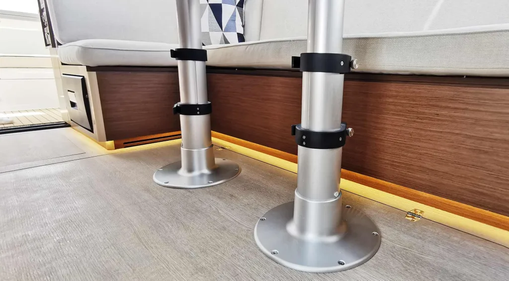 In punkto Kühlung finden Sie einen Standard-Frontloader in Heimqualität, sowie ein weiteres ausziehbares Kühlfach unter der hinteren Esszimmer-Bank. Auf Wunsch können wir in unserer Werft in Zehdenick weitere Kühlmöglichkeiten installieren. Vis-a-vis der Küche finden Sie und Ihre Gäste dann an einem U-förmigen Esstisch Platz. Vier bis fünf Erwachsene bekommen Sie zu einem Dinner bequem unter, wenn das Wetter draußen mal nicht mitspielt. Den Tisch können Sie mit einem Handgriff zu einem kleineren Coffee-Table umbauen. Ausgeklappt und dank Teleskop-Füße noch schneller abgesenkt entsteht hier eine weitere Schlaf- und Lounge-Gelegenheit.